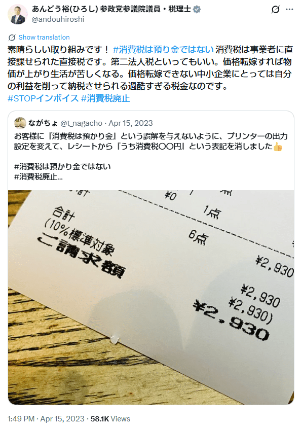 目下、一部ノ政治結社及ビソーシャル・メディアノ言説ニ於テ、「消費稅ハ預リ金ニ非ズ」ト云フ主張囂シ。曰ク「消費稅事業主ノ負擔スル第二ノ法人稅ニ似テ、消費者ノ納付スル所ニ非ズ」ト。然レドモ、是レ消費稅ト云フ稅制ノ有スル間接稅トシテノ基本構造ヲ蔑如セル極論ナリ。